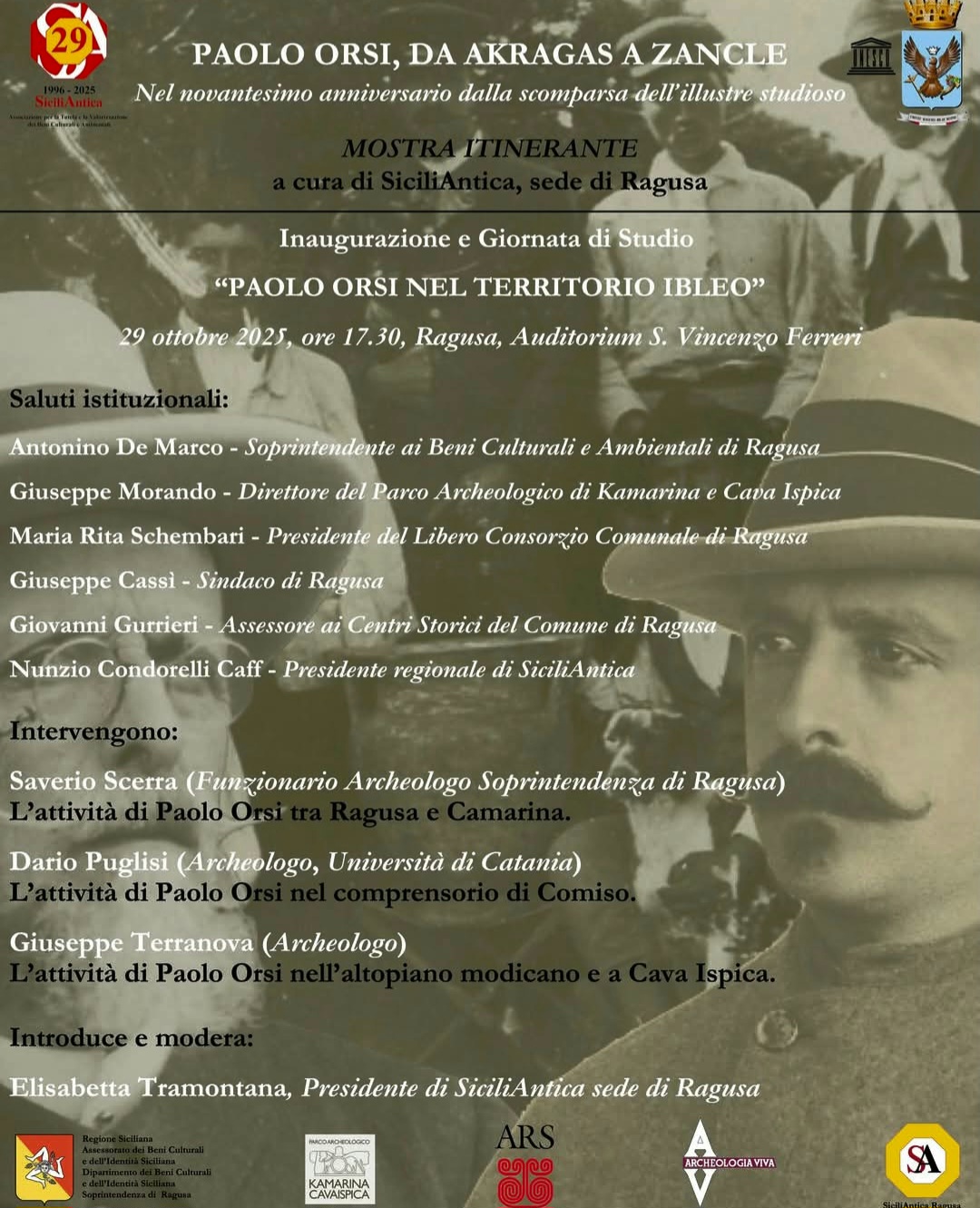 .E’ questo il titolo della mostra promossa dall’associazione SiciliAntica sede di Ragusa , che aprirà i battenti mercoledì 29 ottobre alle ore 17.30 presso l’Auditorium S. Vincenzo Ferreri a Ragusa Ibla.La mostra, promossa con il patrocinio dell’Assessorato regionale dei Beni Culturali e dell’Identità Siciliana, dell’Assemblea Regionale Siciliana e di “Archeologia Viva”a è stata ideata per celebrare il grande archeologo trentino in occasione dell’anniversario della sua scomparsa, e sta viaggiando attraverso le numerose sedi siciliane di SiciliAntica.L’obbiettivo che si prefigge è quello di rendere omaggio a Paolo Orsi, figura cruciale che ha dato lustro all’archeologia siciliana, mettendo in luce il suo operato in diverse località dell’isola da Akragas, oggi Agrigento, a Zancle, antico nome di Messina.La tappa ragusana della mostra si caratterizza, inoltre, per una serie di interessanti iniziative collaterali. Sono previsti infatti, una giornata di studio il pomeriggio dell’inaugurazione, un seminario itinerante dal titolo “Ad Ibla sulle orme di Orsi” che si svolgerà giorno 1 Novembre dalla ore 11.30 alle 13,00 e infine un laboratorio per piccoli archeologi dai 6 a 11 anni denominato “ Piccoli “Orsi” a caccia… di antichità” che avrà luogo il 2 Novembre dalle ore 10.00 alle 12.00 pressp i Giardini Iblei.La mostra resterà aperta sino al 6 Novembre 2025 con i seguenti orari di apertura30-31 ottobre dalle 17.00 alle 20.00: 1-2 novembre dalle 10.00 alle 12.30 e dalle 17.00 alle 20.00 3-:4-5 novembre dalle 17.00 alle 20.00 6 novembre dalle 17.00 alle 18.30Sicuramente un’occasione per conoscere meglio uno straordinario personaggio come Paolo Orsi e il suo legame con il nostro territorio.