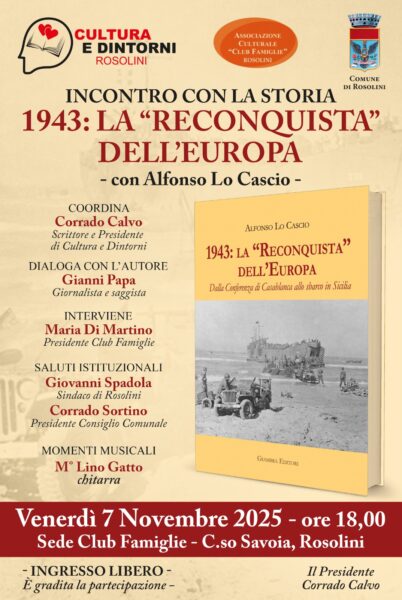 La sede dell'associazione “Club Famiglie" diretta da Maria Di Martino, ha accolto a Rosolini il presidente di Beni Culturali Sicilia, dott. Alfonso Lo Cascio, per la presentazione del suo libro "1943: La "Reconquista" dell’Europa. Dalla conferenza di Casablanca allo sbarco in Sicilia", che riporta e rivela antefatti e spiega le motivazioni, per cui in quell'anno (e non dopo) si arrivò alla scelta della resa incondizionata, la svolta determinante della II Guerra Mondiale. Nel suo genere, un saggio storico “rivoluzionario” per quanto attiene allo stile di scrittura che propone una lettura non pesante, come a volte succede per i test